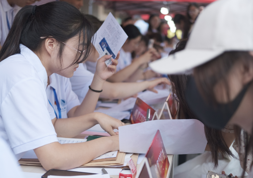 热忱可爱的学长学姐们正在耐心地指导报名流程。纸页翻动,细心讲解,一张张灿烂的笑脸,定格成了秋日最美的图画。