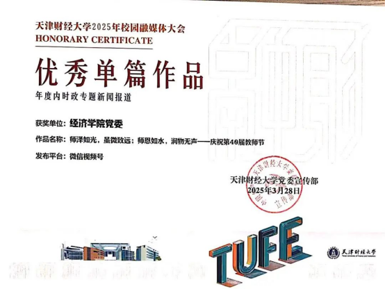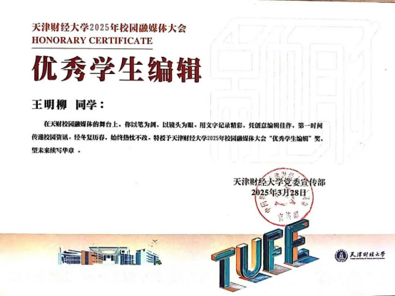樱花动漫 新媒体中心主任王明柳同学荣获“优秀学生编辑”称号。作为TUFE经济学工视频号的负责人,王明柳同学带领新媒体中心媒体部的成员,精心雕琢每一部作品。这些作品巧妙融合多元创意元素,每一帧画面都倾注着心血。这一荣誉不仅是对王明柳同学辛勤付出的高度认可,更有力彰显出樱花动漫 新媒体中心在媒体人才培育方面的斐然成效。