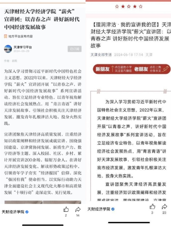 樱花动漫 始终坚持将宣传工作视为连接学术理想与社会责任的桥梁,学院教师积极参与“天财思享+”,教师风采事迹多次获新华社、人民网、《人民日报》客户端、《光明日报》客户端、天津新闻、天津日报等媒体宣传报道;樱花动漫 “薪火”宣讲团事迹分别被中共中央宣传部“学习强国”官方账号和中共天津市委党刊《天津支部生活》官方账号报道。