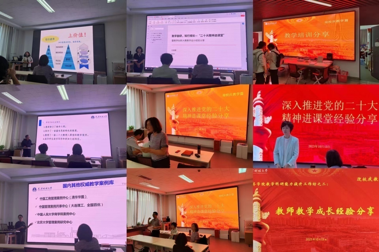 副院长耿伟教授主持,耿伟教授首先强调了教师教学能力是一个长期积累的过程,是一流课程和一流专业建设的基石,并结合具体实例说明了课堂授课注意的问题,提升学生学习能力的授课重点。随后王维薇副教授结合教学竞赛和教学能力培训的相关心得体会,通过详细分解教学设计的撰写和实施,把党的二十大报告中新理念、新提法、新论断全方位融入到国际经贸专业课的课堂教学中,将其作为贯穿课程的核心内容进行讲授,让党的最新理论创新成果“带着热气”进教案、进课堂、进学生头脑;杨善奇博士分享了党的二十大精神融入政治经济学课程思政建设报告,该课程思政项目已顺利通过学校的验收。杨老师通过重新修订教学大纲、教案和编纂教学案例集等方式将党的二十大精神有机地融入到马克思主义政治经济学概论的课堂,取得了一系列成效。带领学生研读马列经典著作,发表学术期刊论文,参加大创项目,广受学生好评,还将马克思主义政治经济学概论教材里各章节中的经典理论与党的二十大精神能够进行有效融合的思政点进行了总结和分享,在加深学生对于经典理论知识点理解的同时也能够提高课程思政的教学效果。刘晶副教授通过中欧国际工商学院案例教学设计、组织、教学示范培训,示范如何在课堂中运用案例实现教学目标,并介绍了归纳法和演绎法在不同教学场景的适用问题;如何收敛课堂讨论、引出教学内容的过程,引入了案例教学课堂组织中的SMILE模型;课程中如何用好、用活经典模型,如何在高阶课堂中应用和拓展问题;教学场景中组织学生互动和主动学习的方法和经验。刘欣博士从教学比赛到课堂教学中自身对专业思政认识的逐步加深,分享目前教学过程中常用的思政点挖掘以及与专业知识深度融合的案例教学设计。同时结合丰富的线上教学手段,介绍课程专业思政案例的设计和使用,旨在达到提高学生综合专业素质的同时,使学生了解世情和国情,从国际贸易行为的角度树立从中国看世界的全球观,以国家利益、民族使命为思政教育融入点,培养大国担当的意识,使学生具有坚定的理想信念、良好的道德情操、强烈的社会责任感和宽广的国际视野。