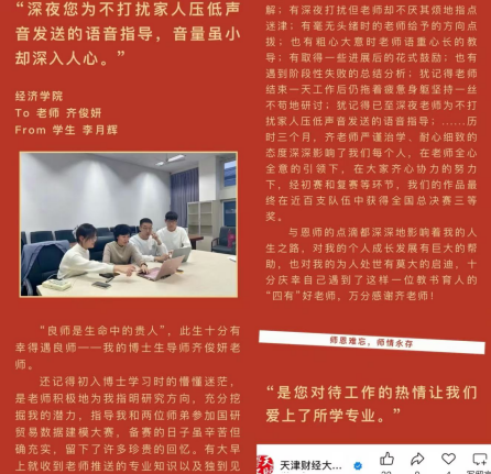 天财思享+专家团成员,利用“小而精”的网络课堂充实思政元素,引导学生正确认识中国开放型经济发展的特色和趋势,先后围绕党的二十大和中央经济工作会议以及天津港产城融合等专题进行微党课讲解四次,并被学习强国转载,使学生深刻理解中国作为世界大国的责任与大国自信,向学生讲好在复杂多变的国际经济形势下的中国开放故事。