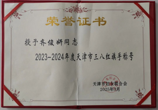 院长、教授齐俊妍同志荣获“天津市三八红旗手”荣誉称号。