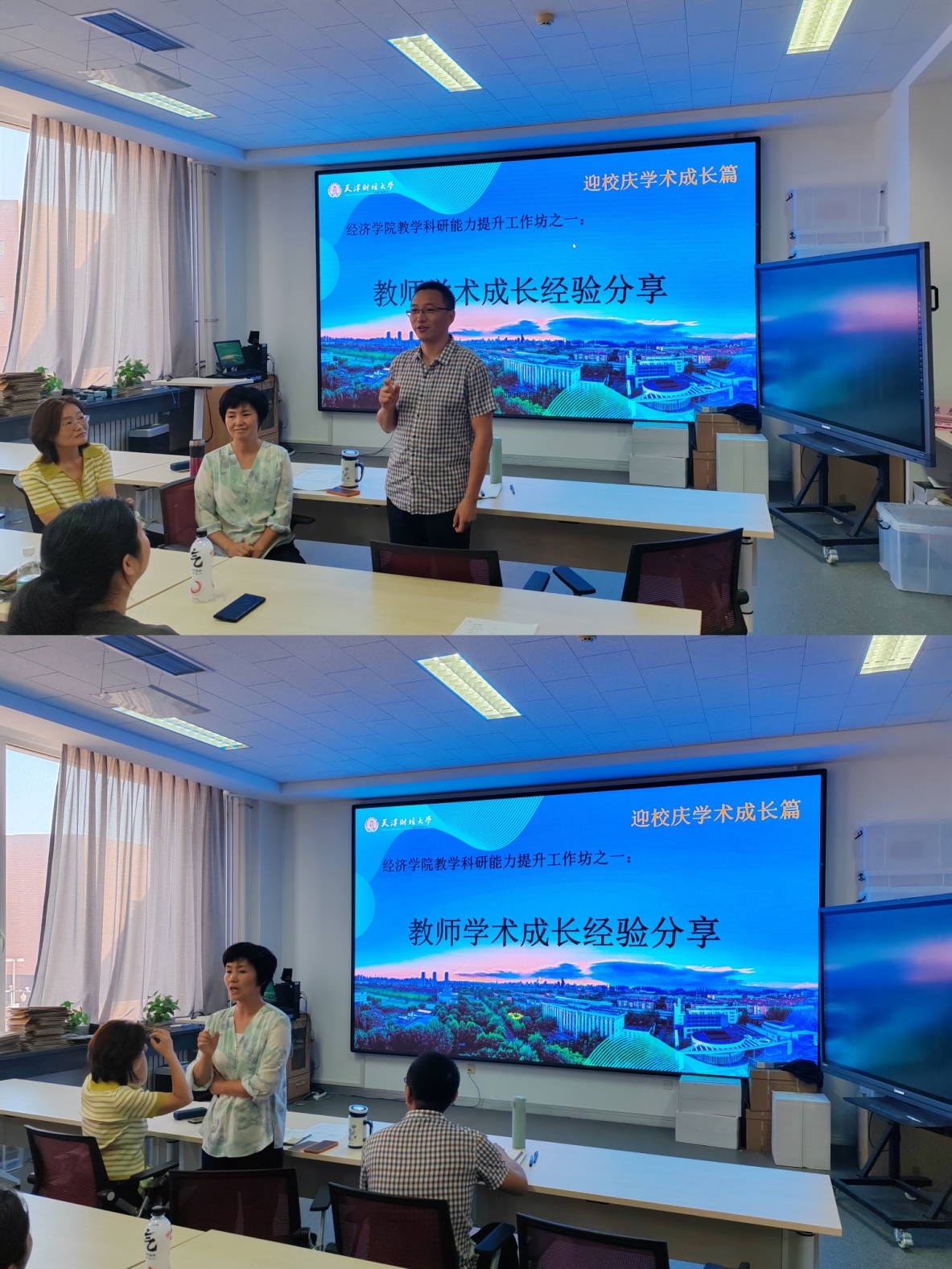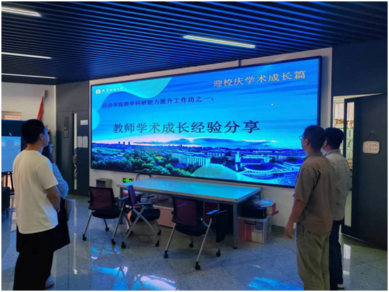 院长齐俊妍教授主持,齐俊妍院长首先强调了教师教学科研能力是一个长期积累的过程,是专业和学科建设的基石,教师的学术成长要与专业学科发展紧密结合。随后王岚教授以教学科研理念为出发点,从教研相长、科研精进等维度,就如何提升教学效果,积累科研成果,提升学术影响力等方面分享了相关经验,助力青年教师的成长;房林副教授分享了自身科研成长案例,以及对科学研究和教学的感悟:首先,勤奋,不怕慢就怕停;其次,保持研究的敏锐性;再次,基础理论与实践有机结合,研究做到顶天立地;最后,教学科研相互促进;杨勃副教授结合自身科研和教学经历,分享科研规划、项目选题、理论创新、科研与教学的融合等方面的经验和感想,帮助青年教师更快融入科研和教学工作;杨善奇博士从自身撰写论文经验出发,总结出一篇理论性论文的四个组成部分,包括新颖的题目、形式和理论上的创新、文献的权威性和时效性、文笔的凝炼。此外,杨善奇博士也进一步分享了国家级课题申请书撰写过程中遇到的一些问题和经验总结,在申报课题时一定要有耐心和决心,精益求精;赵文涛博士分享了她入职两年来的教学和科研成长体会,尤其指出学院及所在团队对她成长的宝贵引领作用。在教学方面,通过旁听优秀教师课程,积极参加培训、讲座等方式,提升教学基本功。在科研方面,强调了学院及科研团队的重要作用,此外,还要多关注会议或各类课题申报机会,时刻学习、不断提升自己。副院长耿伟教授和韩廷波书记分别进行了点评和总结发言,激励老师们多多参与各项教学科研活动,不断提升自身教学科研能力。