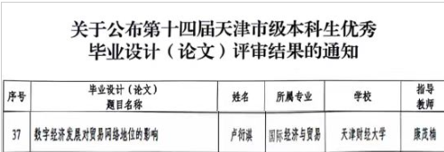 近日,天津市教委公布了第十四届天津市级本科生优秀毕业设计(论文)的评审结果,樱花动漫 康茂楠博士指导的论文《数字经济发展对贸易网络地位的影响》(作者:国贸1902 卢衍淇)获评“第十四届天津市级本科生优秀毕业设计(论文)”。